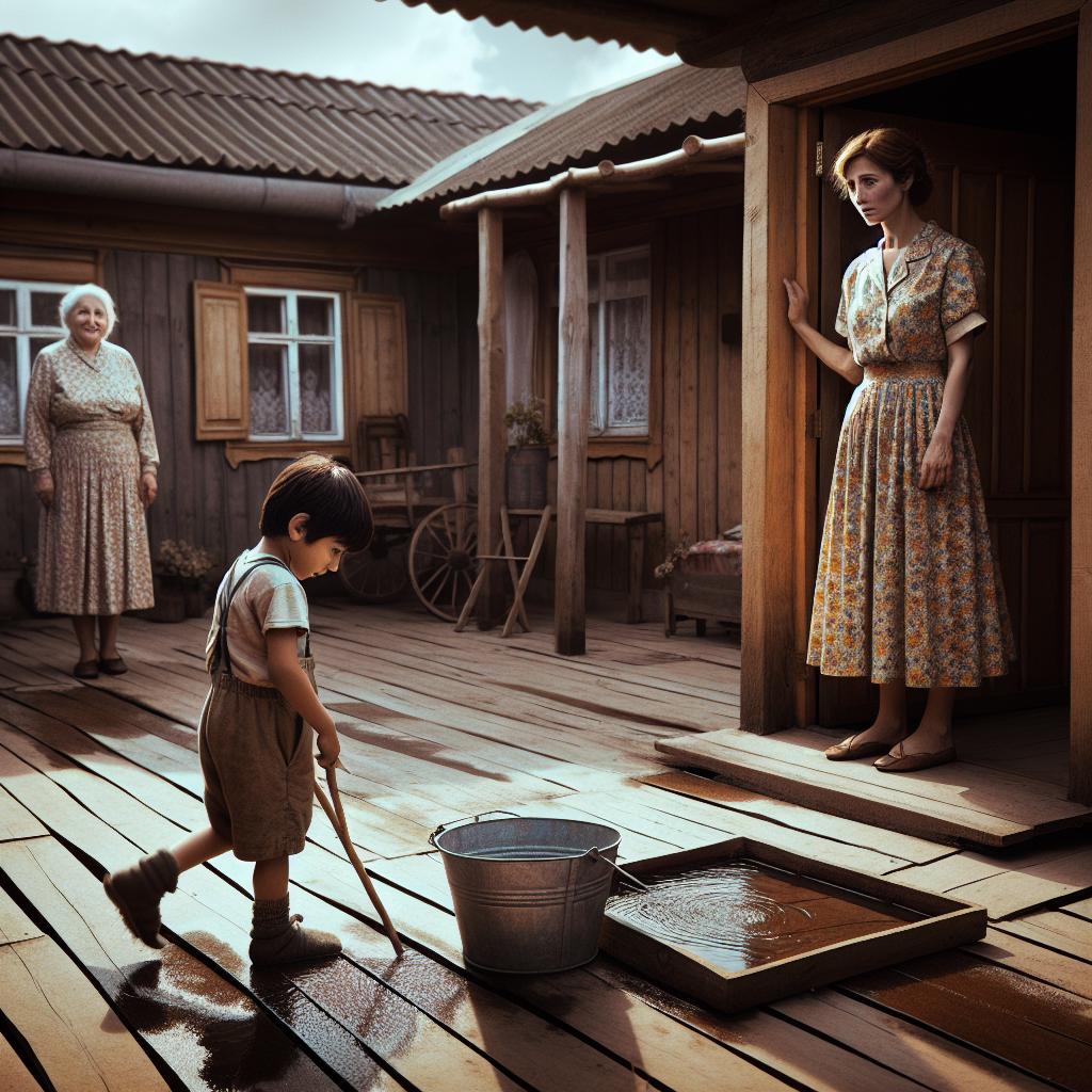 Юра в този момент си играеше в двора. Хукна при майка си. Тя бързо изтича на верандата. В ръцете си държеше черпак с вода, който, щом видя мъжа, изпусна върху боядисаните дъски.