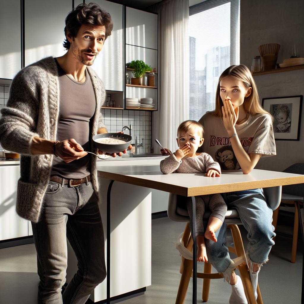 Лъжицата се изплъзна от ръцете на Венета и с глух звук тупна в недоядената каша на дъщеря им. Момиченцето реагира мигновено: устните ѝ се изкривиха, веждите се сближиха, и от гърлото ѝ се изтръгна сърдито сумтене. Венета, без да откъсва поглед от съпруга си, посегна към салфетката, за да избърше кашата от брадичката на детето.