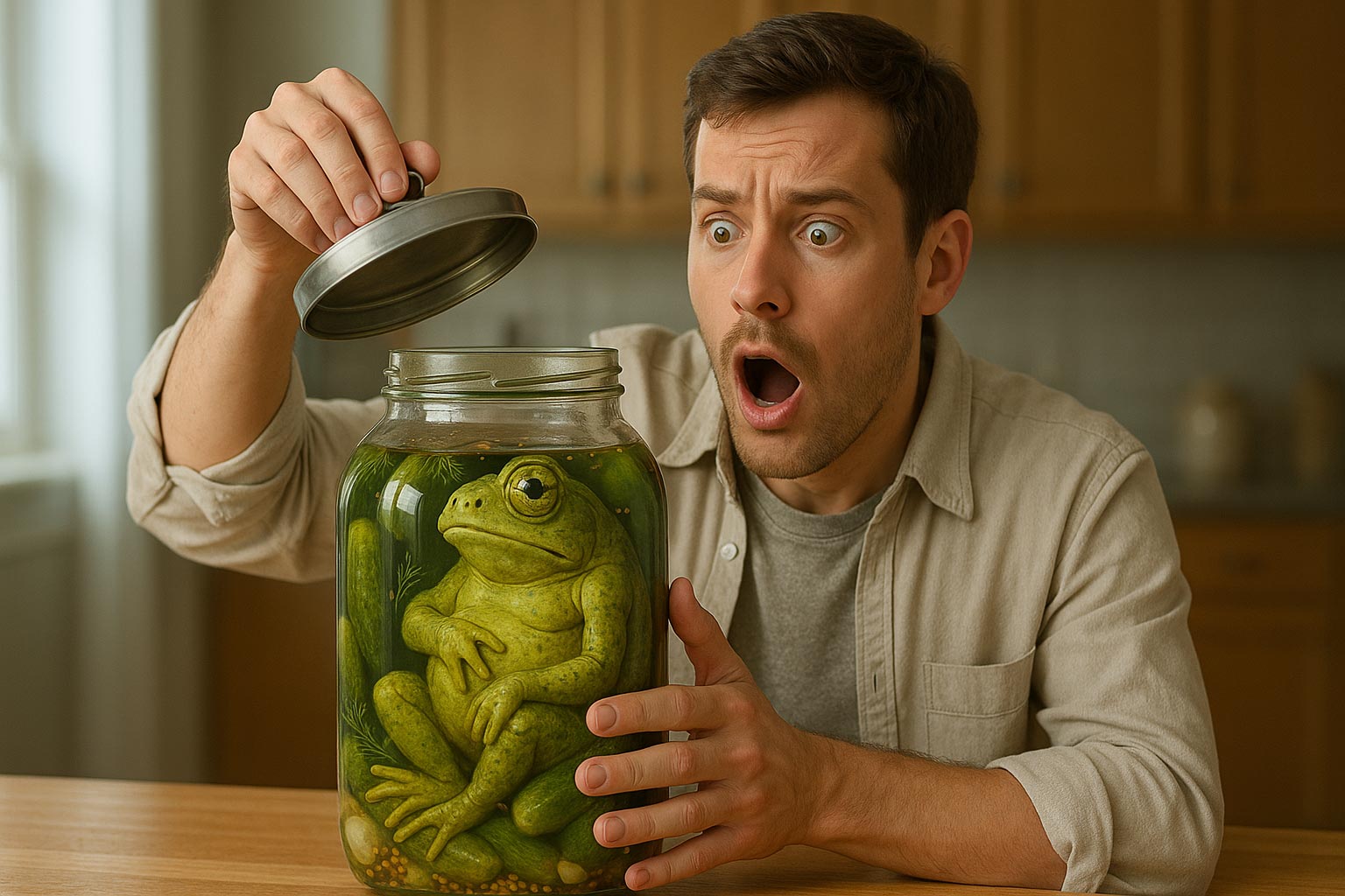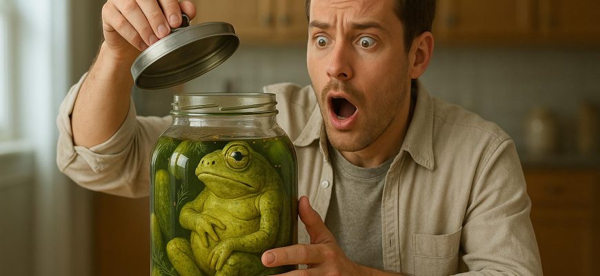 Марк поставил буркана на масата, взел отварачката и с леко щракване свалил капака. В този момент го лъхнал познатият аромат на саламура и копър. Но когато погледнал вътре, замръзнал. Между краставичките, наполовина скрита в мътната течност, се виждала тъмнозелена форма. Първо си помислил, че това е просто зле обелена краставица. Но когато се вгледал по-внимателно, разбрал — това не е зеленчук.