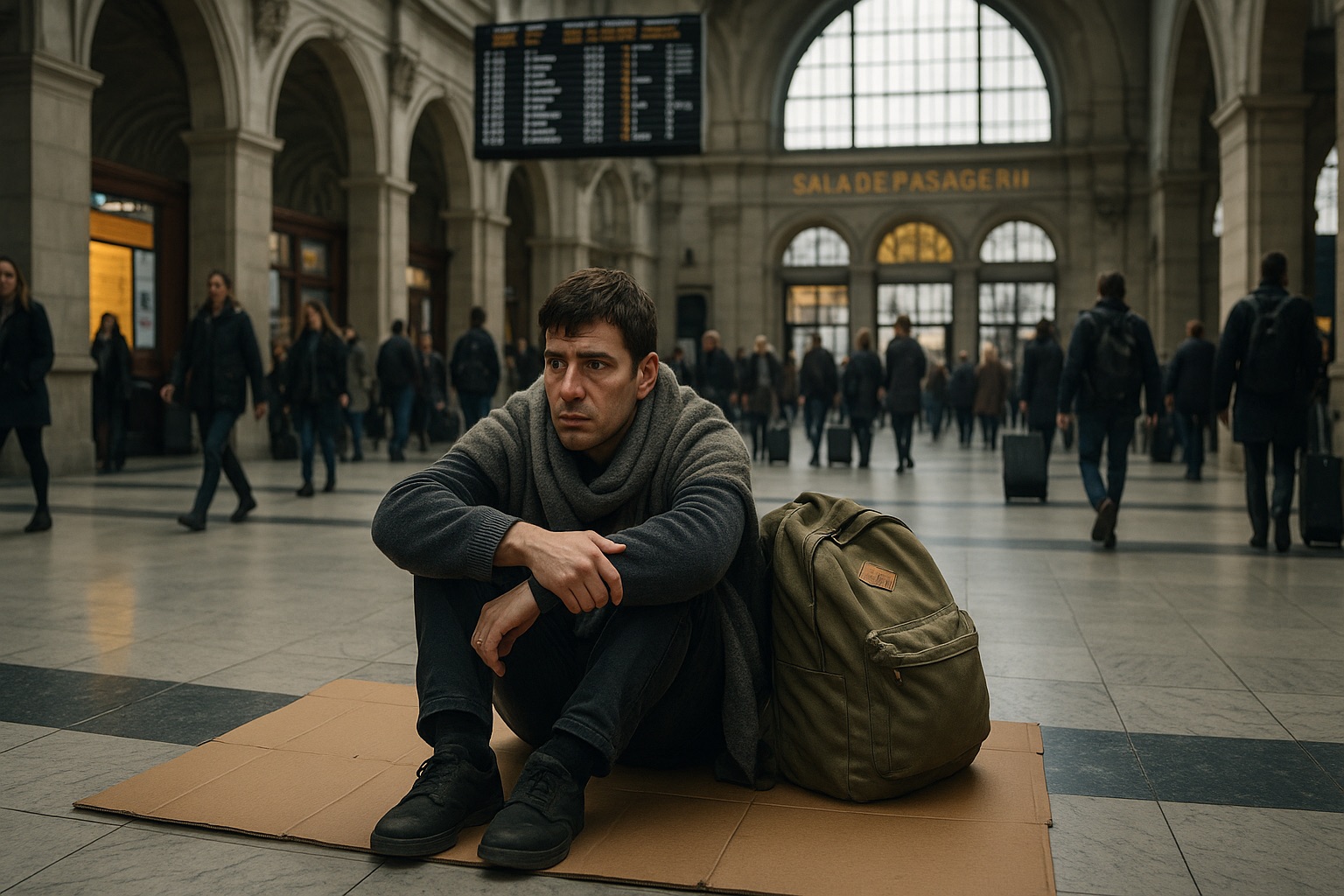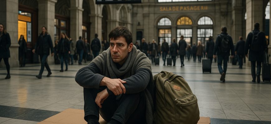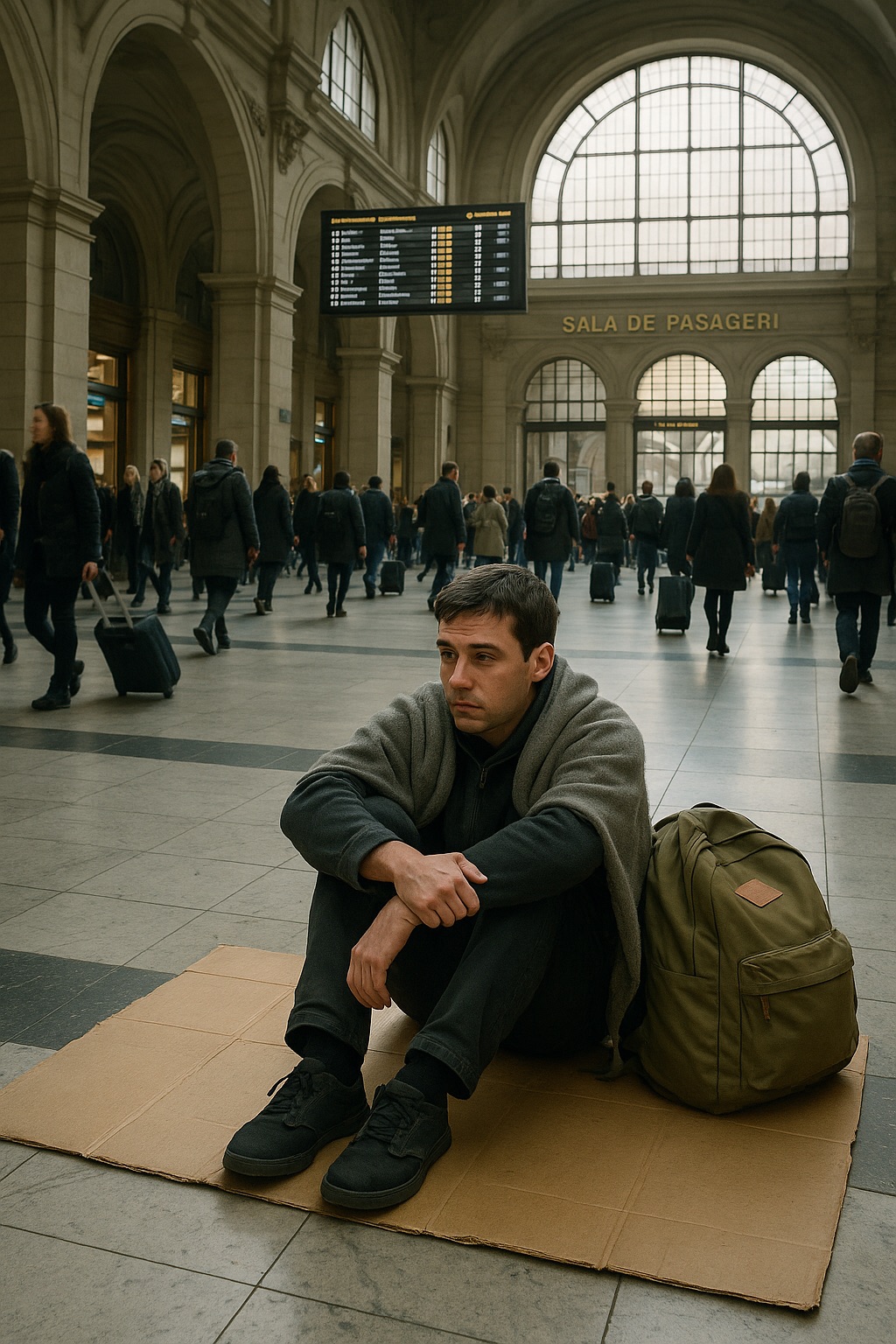 Разпознах го веднага, въпреки че бяха минали почти двайсет години. Същото остро изражение, същите светли очи. Беше свит върху мокър картон, точно до чакалнята, с една раздърпана раница, притисната до него.
