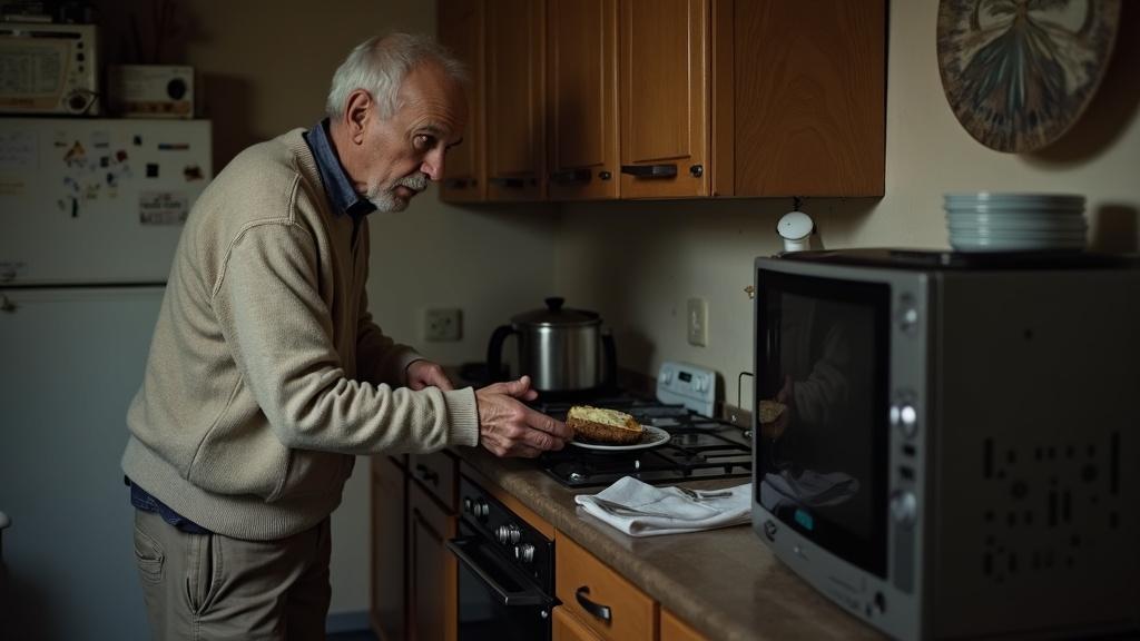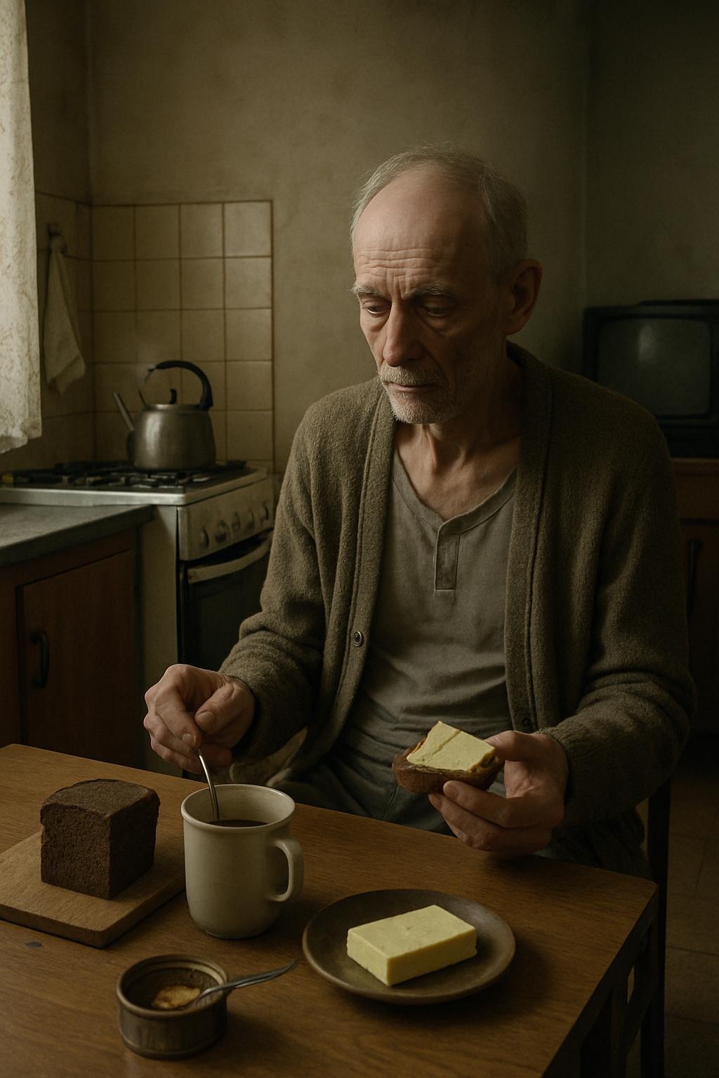 Първите четиридесет дни минаха като насън. Вдовецът механично топлеше чайника сутрин, маже черен хляб с масло. Ядеше, без да усеща вкуса. На обяд отваряше консерва „Сайра“… Понякога сваряваше елда. Веднъж седмично излизаше за покупки.