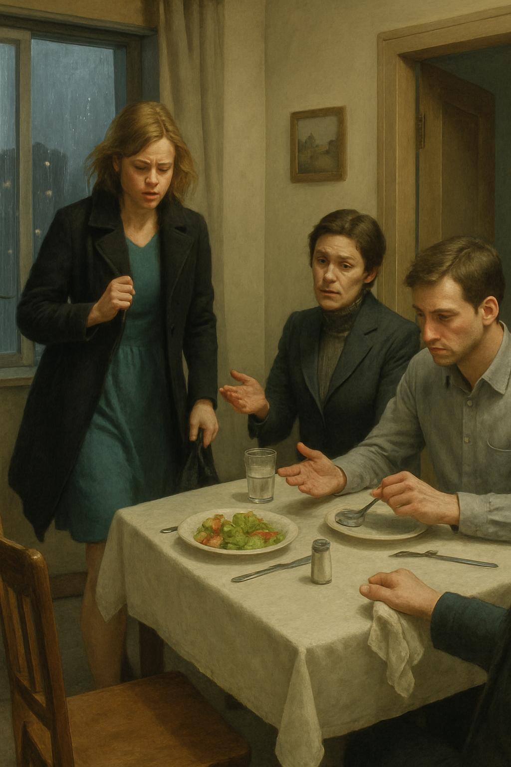 Мария седеше на масата и се опитваше да не трепери с ръце. Чинията със салатата беше изстинала, но тя дори не беше докоснала храната. Срещу нея седеше Камелия — величествена, с перфектна прическа и строг поглед. Мартин мълчеше и нервно въртеше вилицата си.
