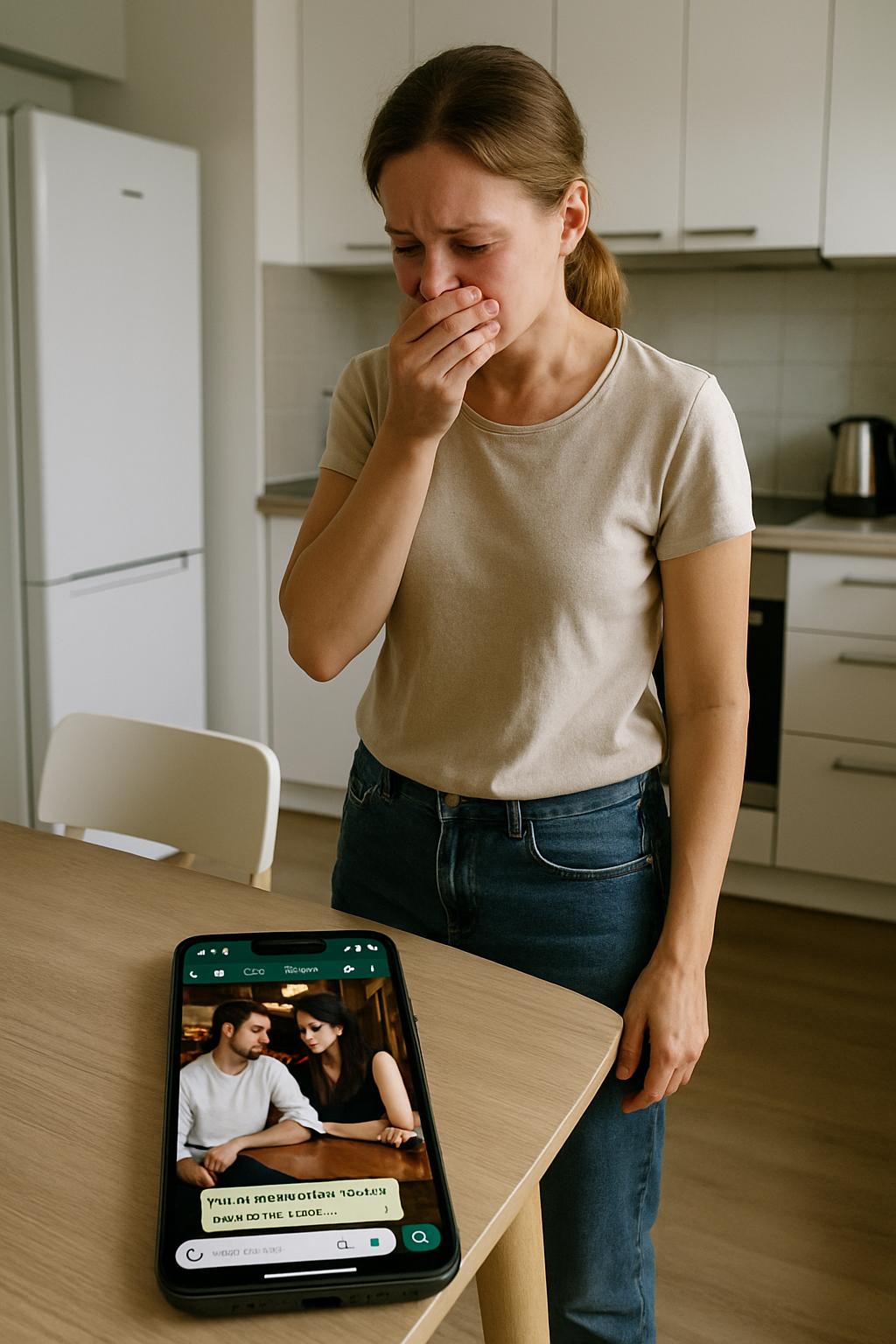 Изстинах цялата. Разговорът беше отворен върху снимка: той — с бяла риза — седи в бар до жена; тя е висока брюнетка със стегната рокля и дълги лакирани нокти върху бедрото му. Снимката бе направена в Дубай. Всичко необходимо вече беше ясно на екрана.
