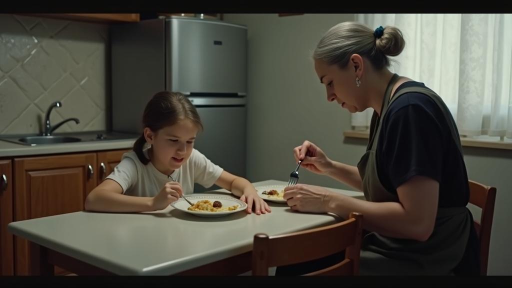 На масата седеше дребно деветгодишно момиче. Погледът ѝ беше закован в оскъдната лъжица картофено пюре, размазана по порцелана в тънък, неравен слой, който изглеждаше по-скоро като подигравка, отколкото като храна. Самата гледка свиваше сърцето – само преди няколко часа кухнята беше изпълнена с топлия, примамлив аромат на току-що изпържени кюфтета.