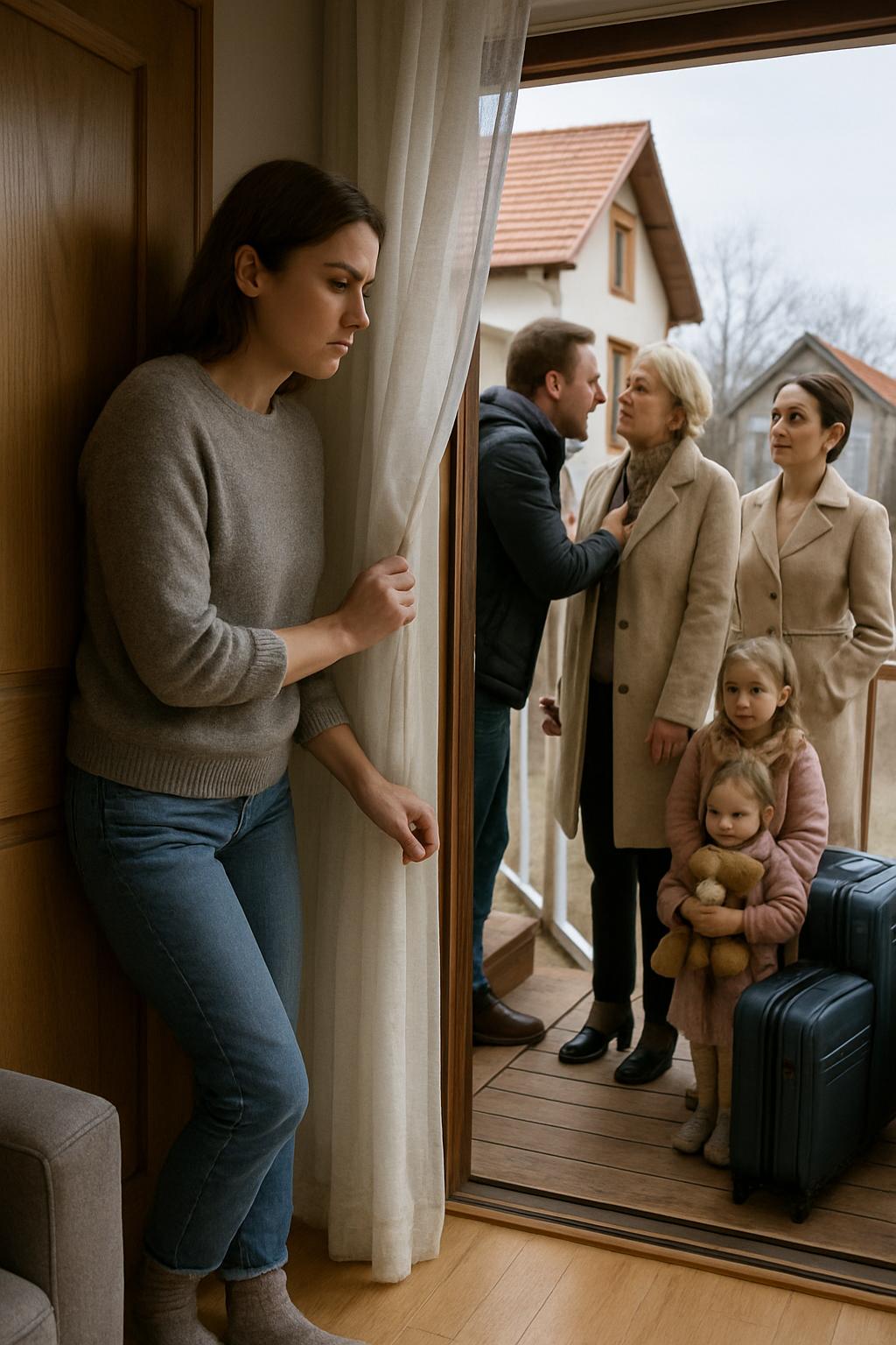 Тя не отговори веднага. Вместо това прекоси хола, отмести тюлената завеса и погледна през прозореца. На стъпалата стояха трима души: Венета с любимото си бежово палто, Галина с прецизно оформена прическа и Десислава, стискаща плюшеното си мече. До тях се издигаха купчини куфари. Ясно беше – не ставаше дума за уикенд. Нито за „само да видим“. Те идваха да останат.