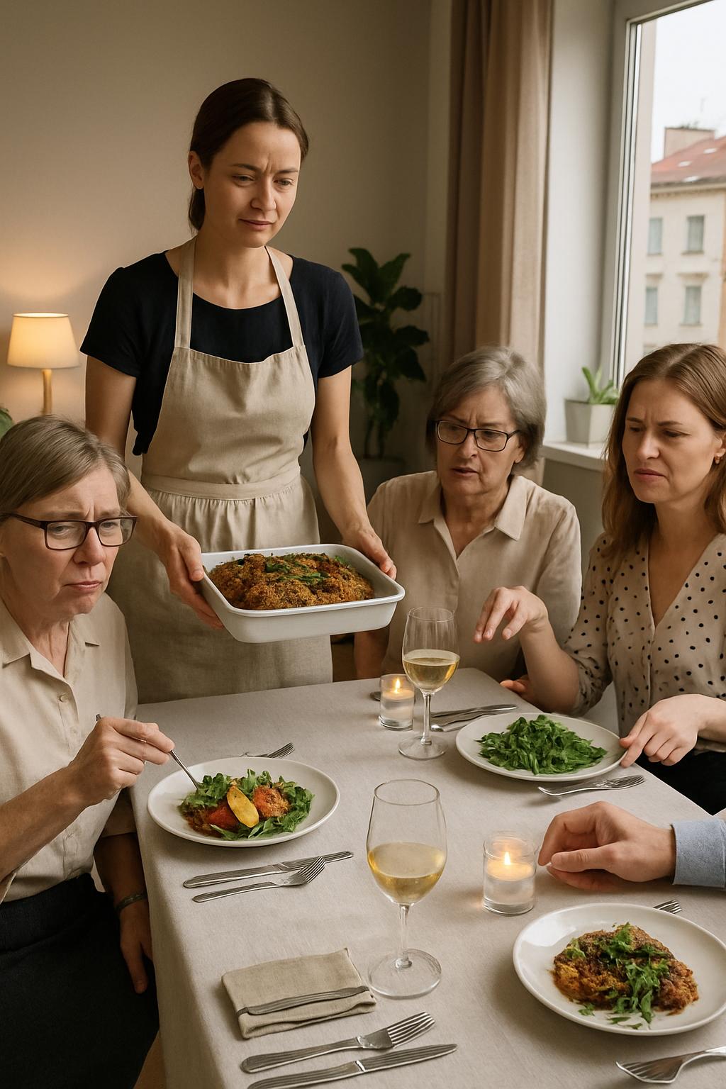 След близо две денонощия, прекарани почти без сън – между пазара, печката и кухненския плот – Камелия усещаше как нервите ѝ са опънати до краен предел. Стоеше в края на масата с поднос горещо ястие в ръце, обгърната от аромат на чесън и розмарин, а усмивката ѝ постепенно се втвърдяваше като гипсова маска.
