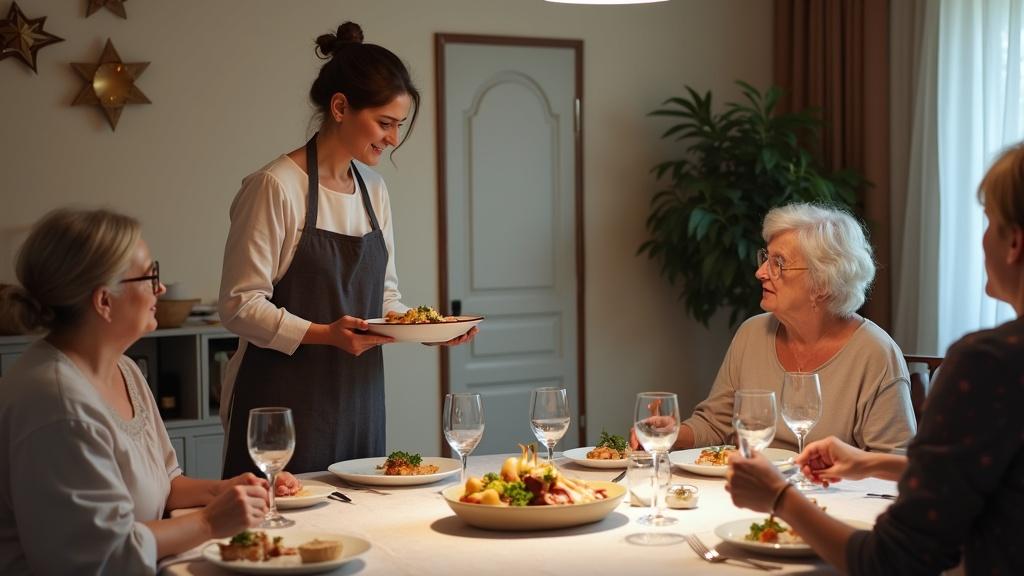 След близо две денонощия, прекарани почти без сън – между пазара, печката и кухненския плот – Камелия усещаше как нервите ѝ са опънати до краен предел. Стоеше в края на масата с поднос горещо ястие в ръце, обгърната от аромат на чесън и розмарин, а усмивката ѝ постепенно се втвърдяваше като гипсова маска.
