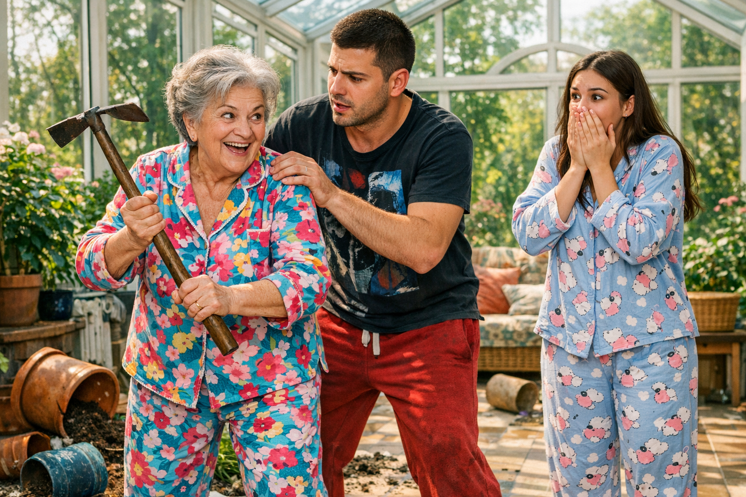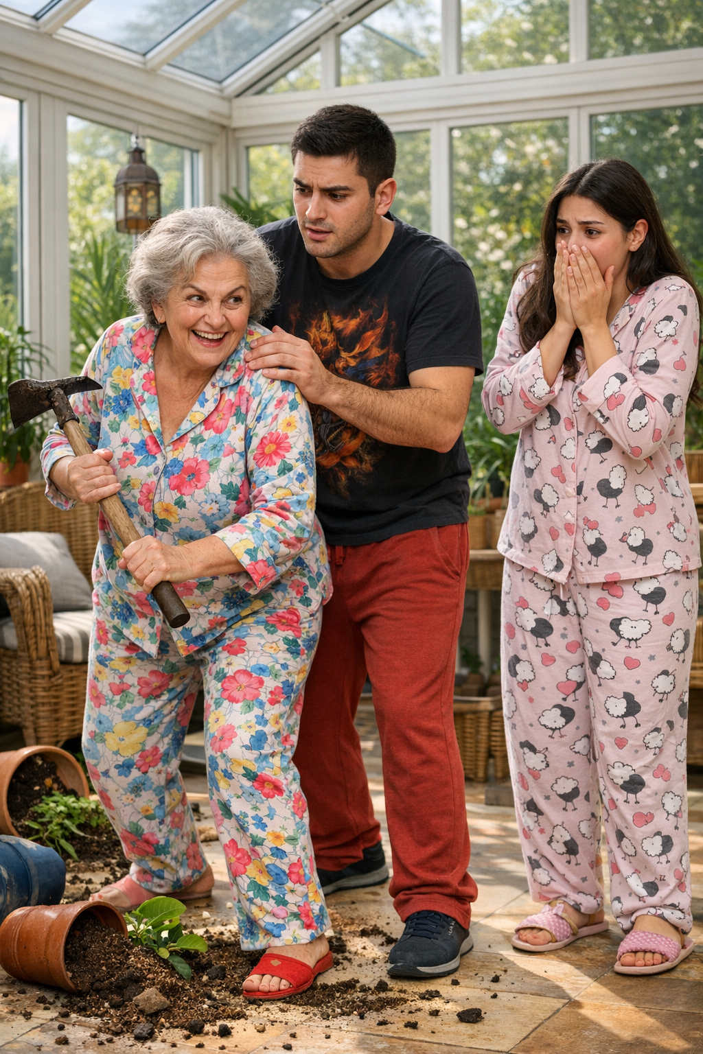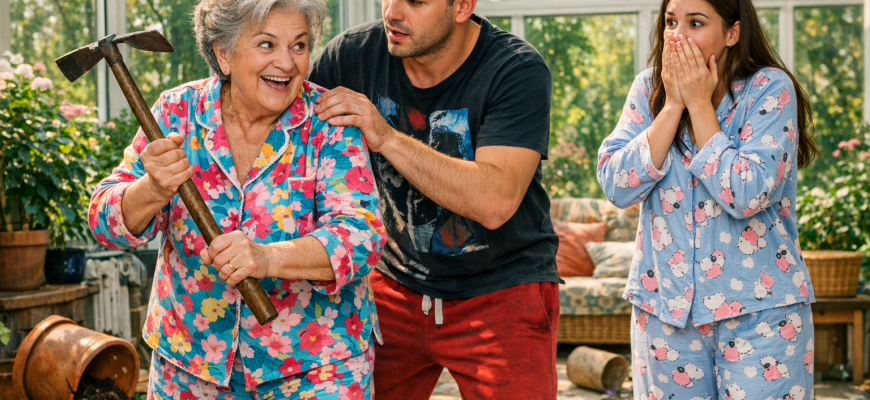 В средата на верандата стоеше Надежда Калинова. Свекървата ѝ дишаше тежко, стискайки в ръце масивна метална мотика с дълга дръжка — очевидно взета от отключения навес. Наоколо се търкаляха буци пръст, пречупени наполовина стъбла на редки папрати и остри парчета от италиански глинени кашпи.