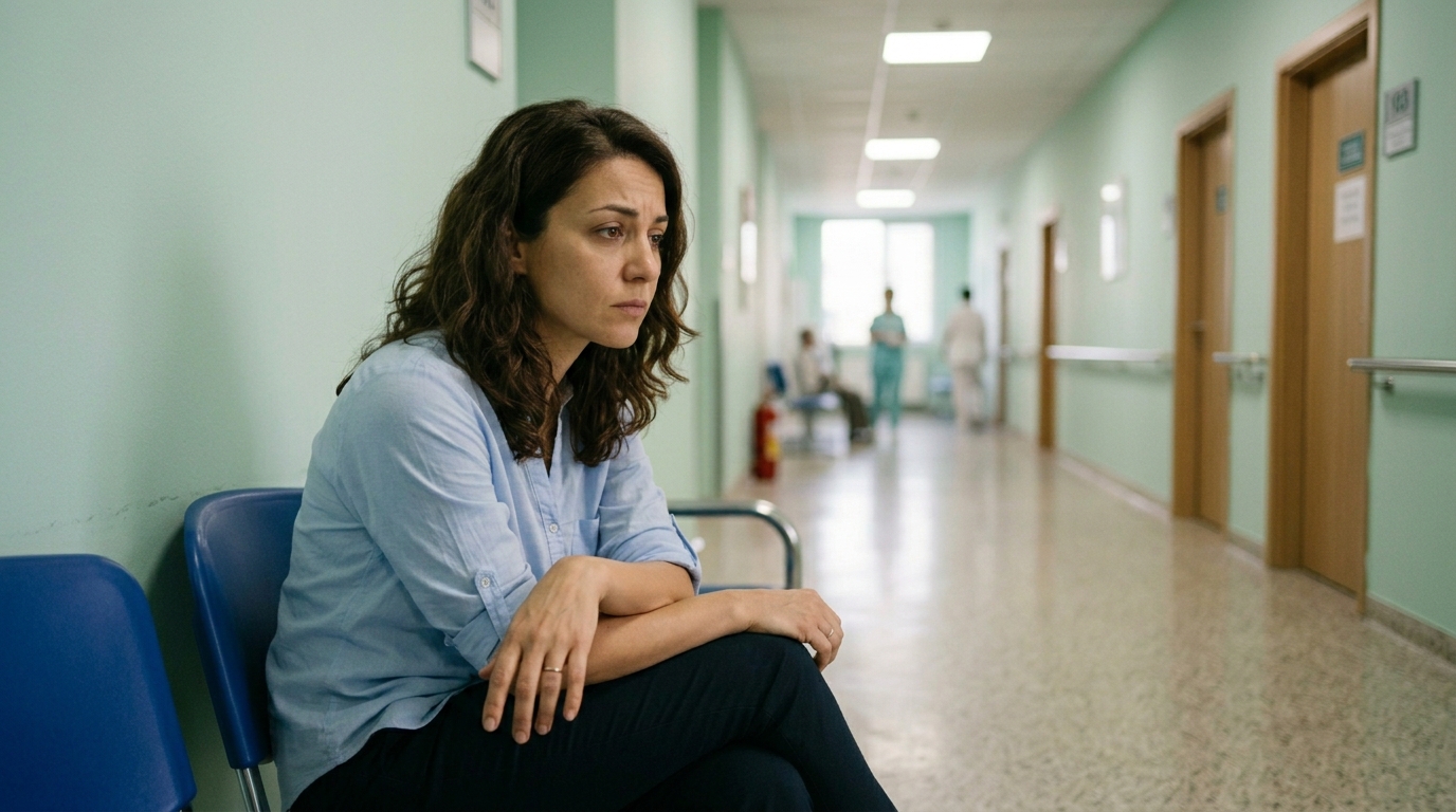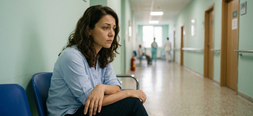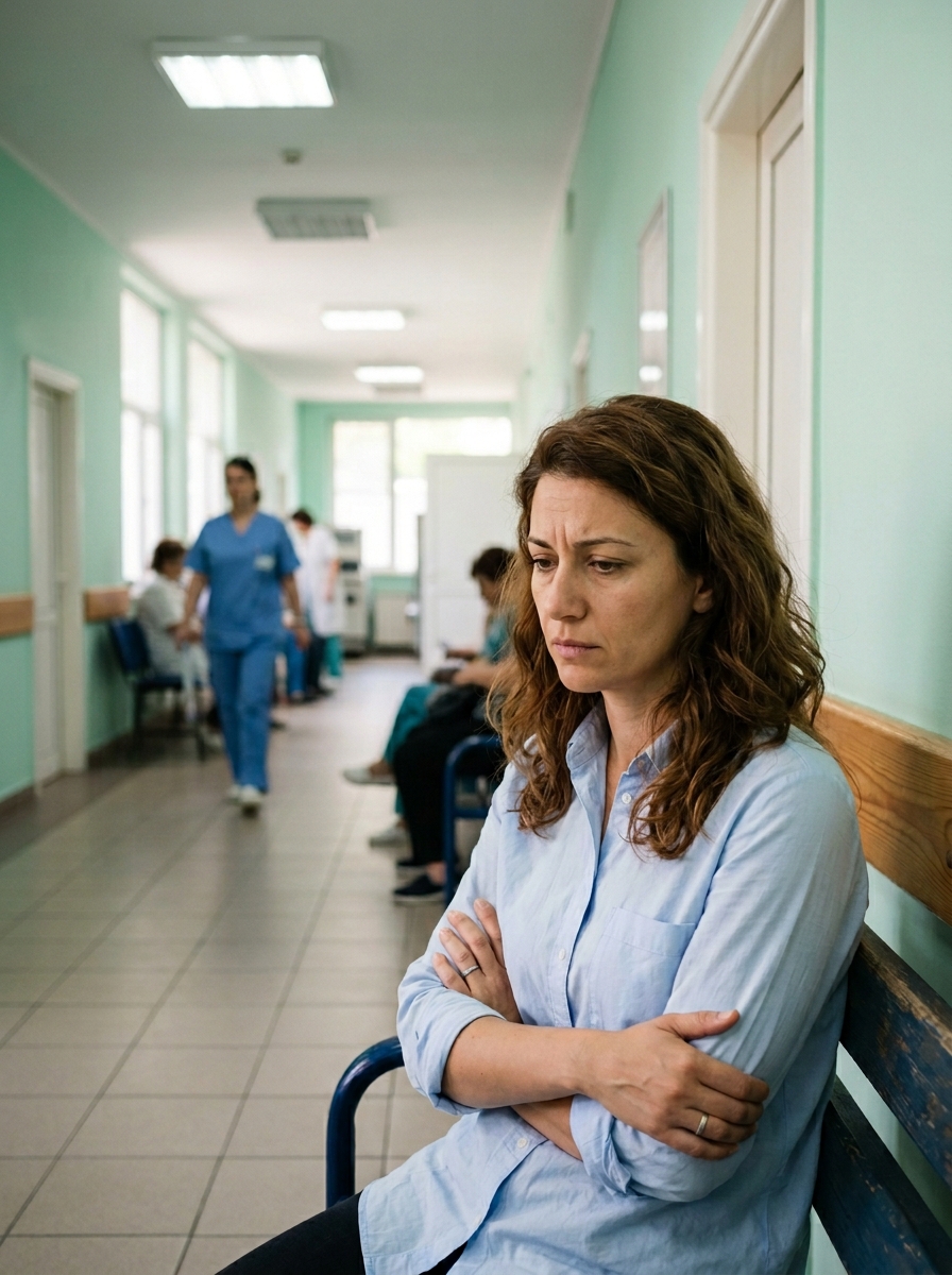 Коридорът беше притихнал. Някъде далеч, в друго крило, плачеше дете. Санитарка в светлосиня престилка буташе количка; колелата ѝ скърцаха по пода.