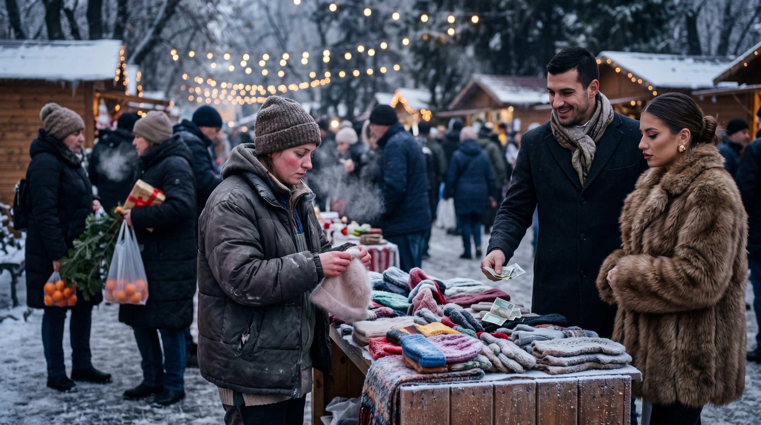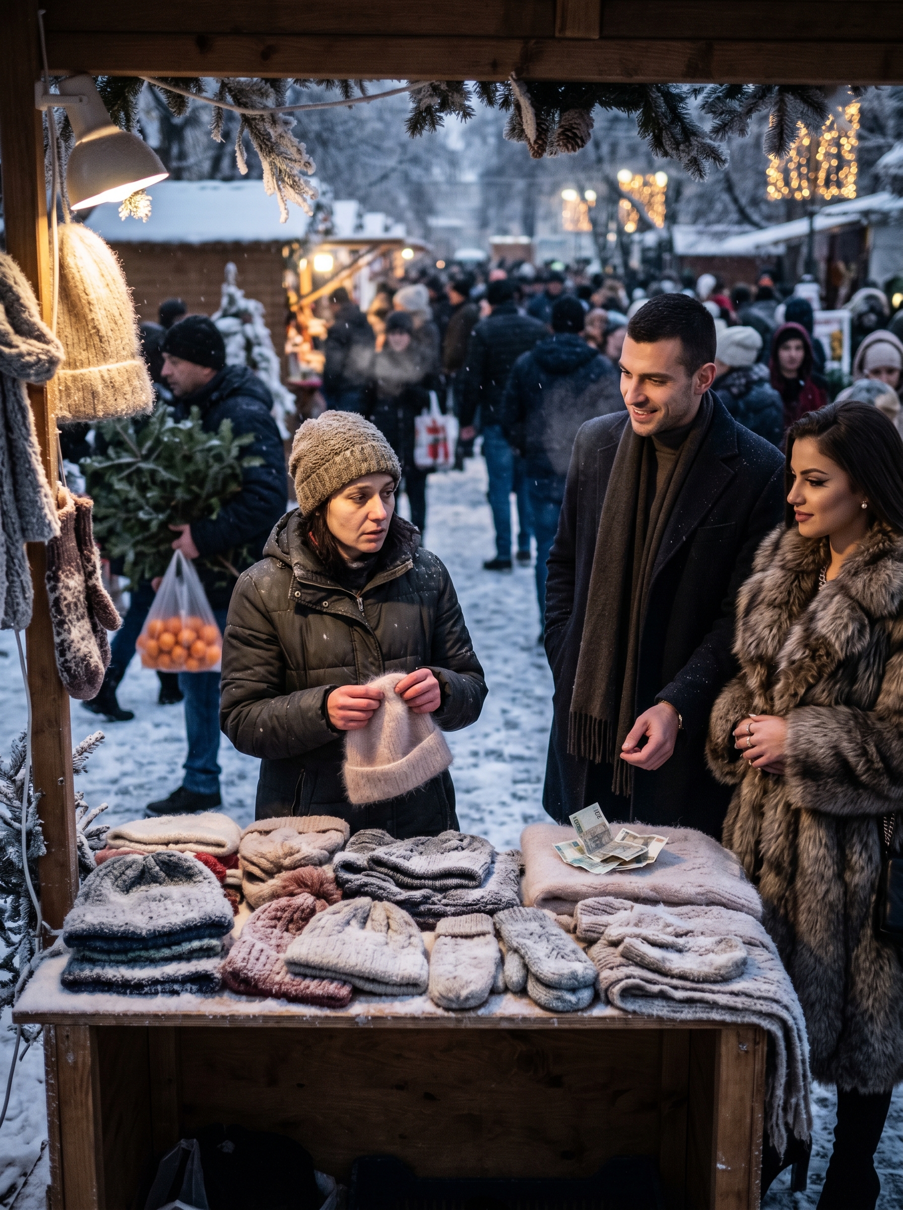 Пазарът клокочеше от предпразнична суматоха. Хората мъкнеха пликове с мандарини, елхи и опаковани подаръци. Блъскаха се, смееха се, караха се. А аз стоях зад масата си, отрупана с плетива — шапки, шалове, ръкавици. Всичко беше изработено през есента — аз и една майсторка бяхме прекарали месеци над преждата. Пръстите ми бяха толкова измръзнали, че едва ги усещах; размествах кълбетата вълна просто за да ги раздвижа.