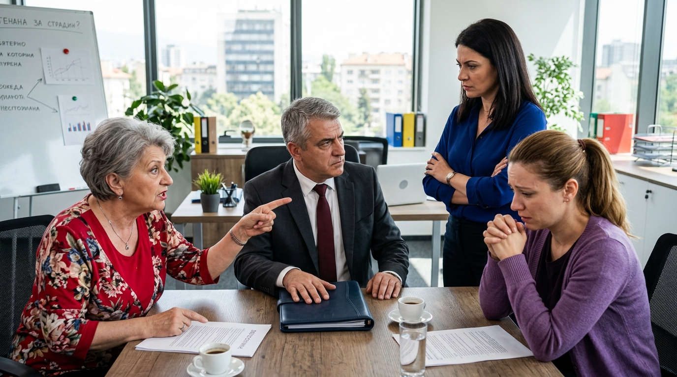 Надежда Валентинова седеше с ръце, преплетени в скута. Погледът ѝ беше вперен през прозореца, където сивият априлски ден висеше тежко над града. Преди половин година Борис се беше свлякъл насред производствения цех — във въздуха още се носел аромат на ванилия и топло тесто. Лекарите казаха, че всичко е станало за миг — откъснат тромб. Тя дори не беше приела напълно, че той няма да се върне, а вече я довлякоха тук, защото Маргарита и Даниела нямаха търпение.