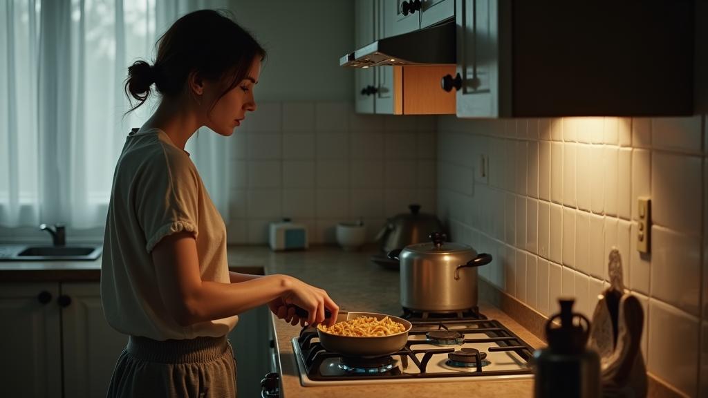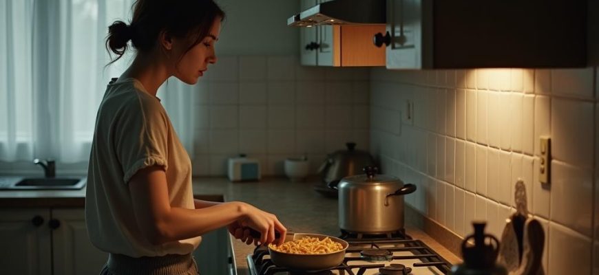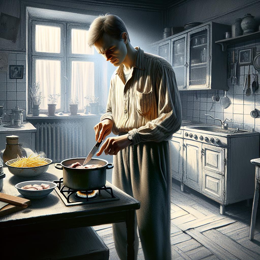 С ярост Настя няколко пъти замахна с ножа върху дроба, преди да го сложи в тигана, където вече се запържваше лукът. Захлопвайки капака с трясък, тя насочи поглед към макароните и механично ги разбърка. Лъжицата изхвръкна на масата, удряйки се със звън в стената.